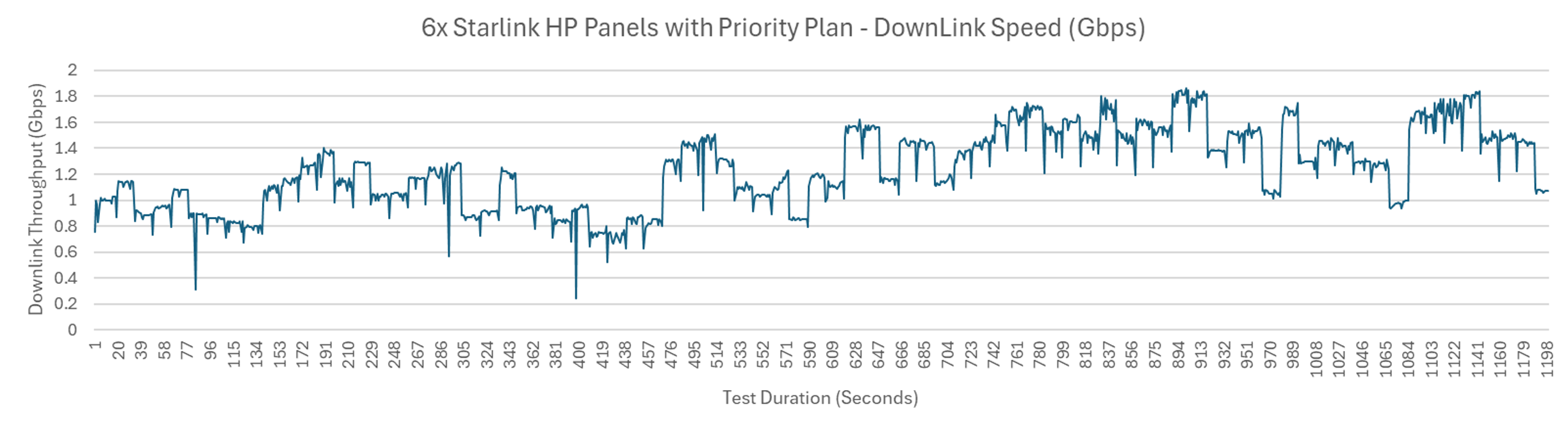 Six bonded Starlink Panel Speedtest Download, Gbps vs time (seconds)
