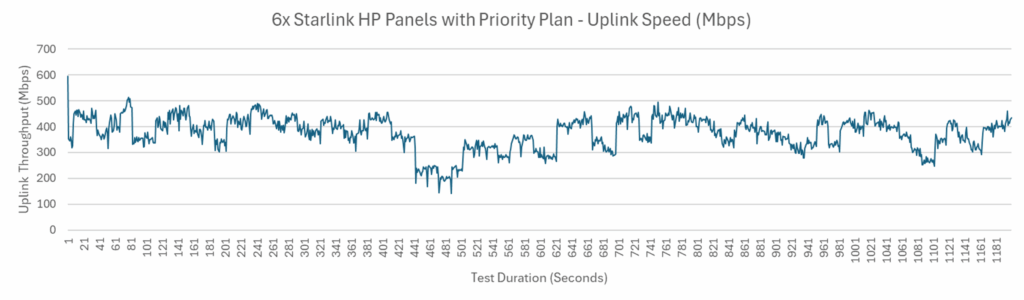 Six bonded Starlink Panel Speedtest Upload, Gbps vs time (seconds)